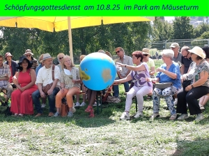 Mit der Kraft es heiligen Geistes werden wir die Welt verändern Schöpfungsgottesdienst Sonntag, 10.08.2025 um 12 Uhr im Park am Mäuseturm - - - - - - - - - - - - - Musikalische Gestaltung: Generations - - - - - - - - - - - - - Anschließend Mitbring-Picknick |