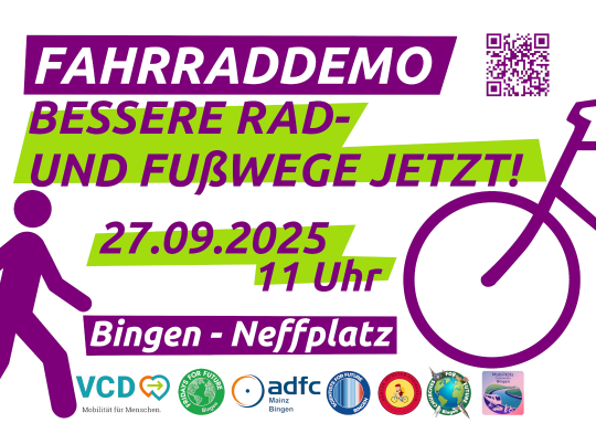Fahrraddemo - bessere Rad- und Fußwege Jetzt! Datum: Sa 27.09.2025 Uhrzeit: 11:00 Uhr Veranstaltungsort: Bingen- Neffplatz |
